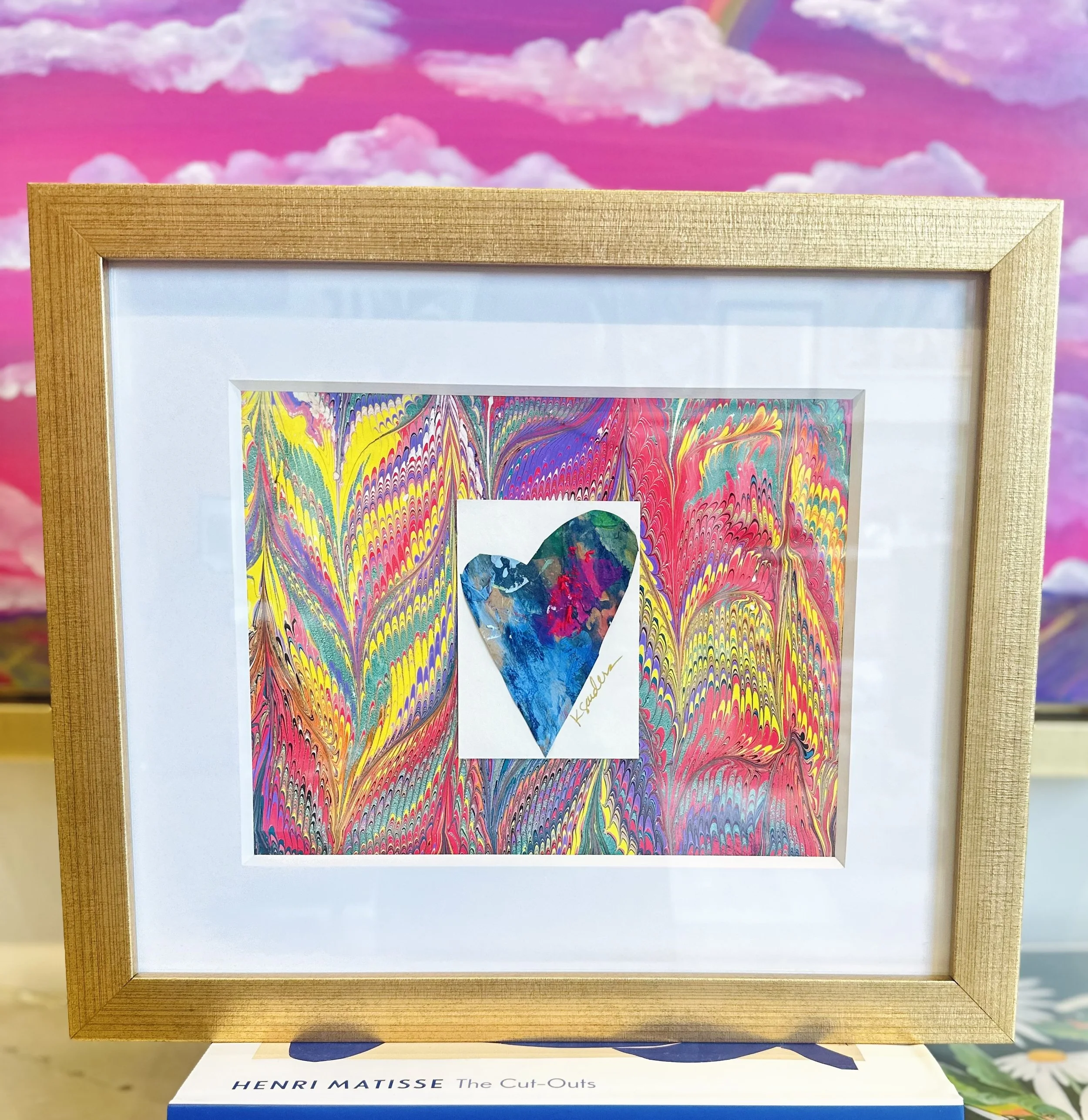 This Piece is 15×15” framed in a gold frame with a piece of handmade red, yellow and pink marbled paper as a mat and 3 dimensional multicolored heart resting on a white collaged paper.