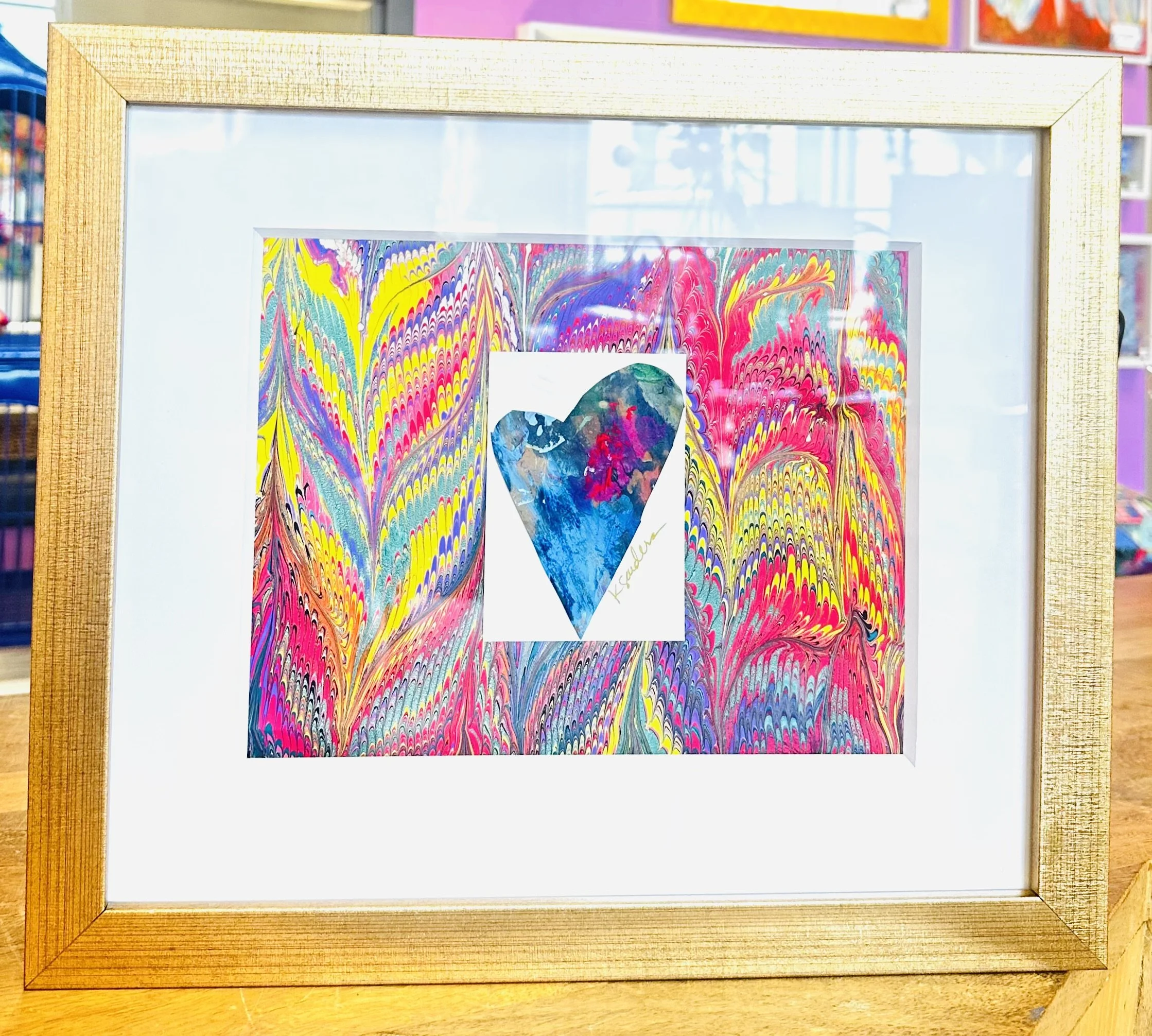 In this series you with find many shapes and sizes. Each is made with hand created marbled papers, globs of studio paint, and painted papers each of these crafted hearts is unique. Many are sculptural in nature extending from the surface with unusual textures. Some have acrylic pour on top. All of these have glass and are in a deep frame.