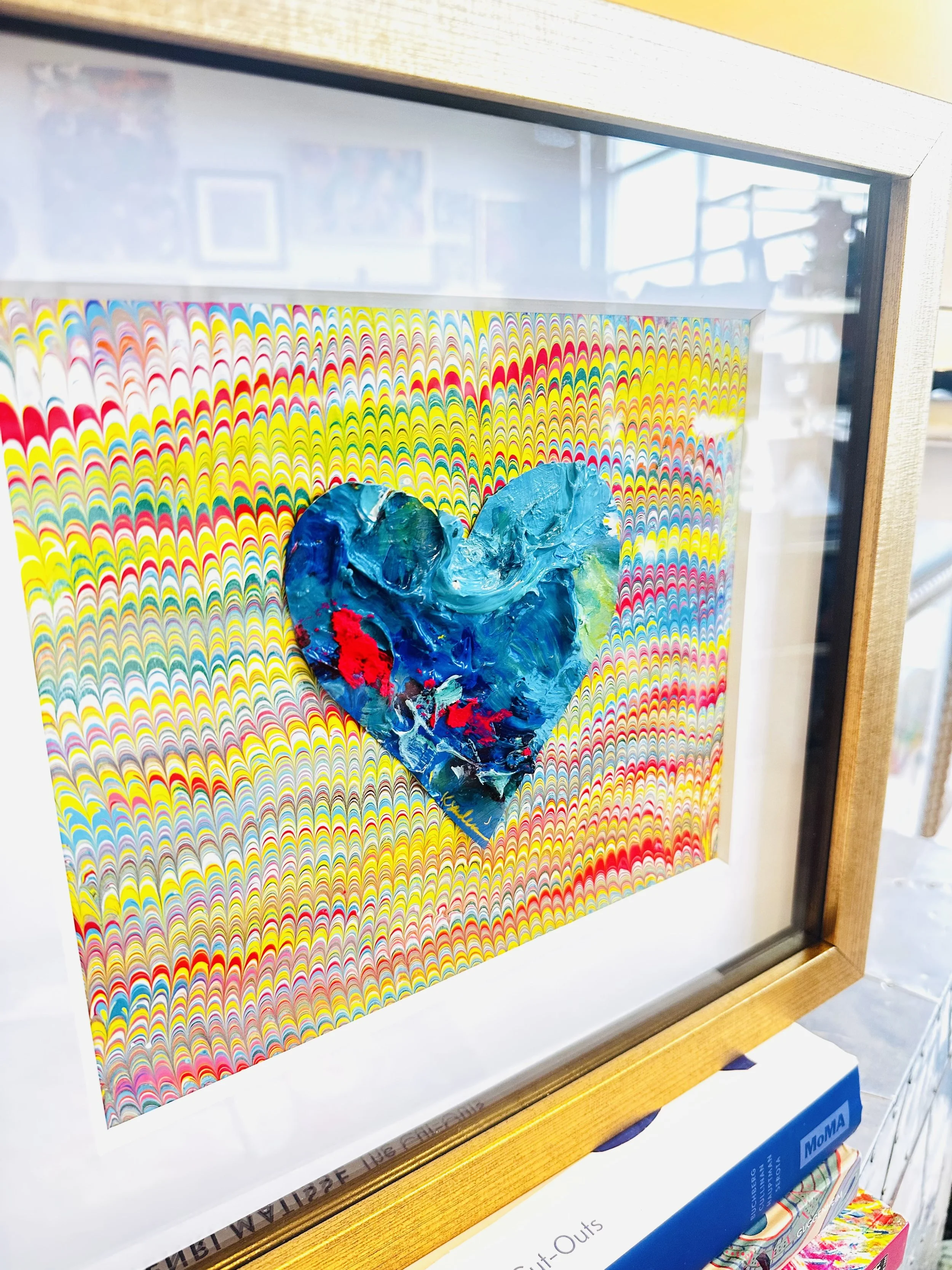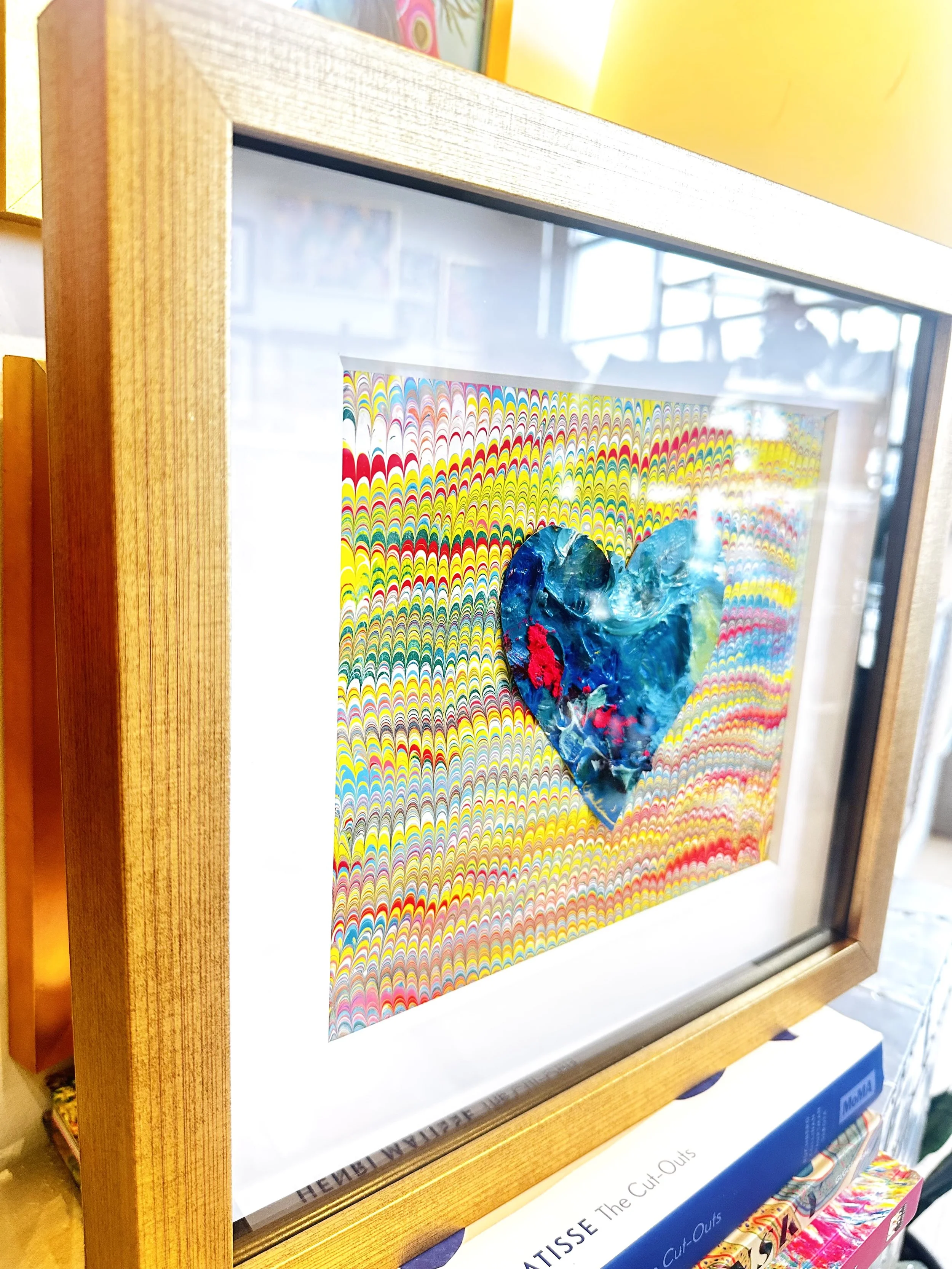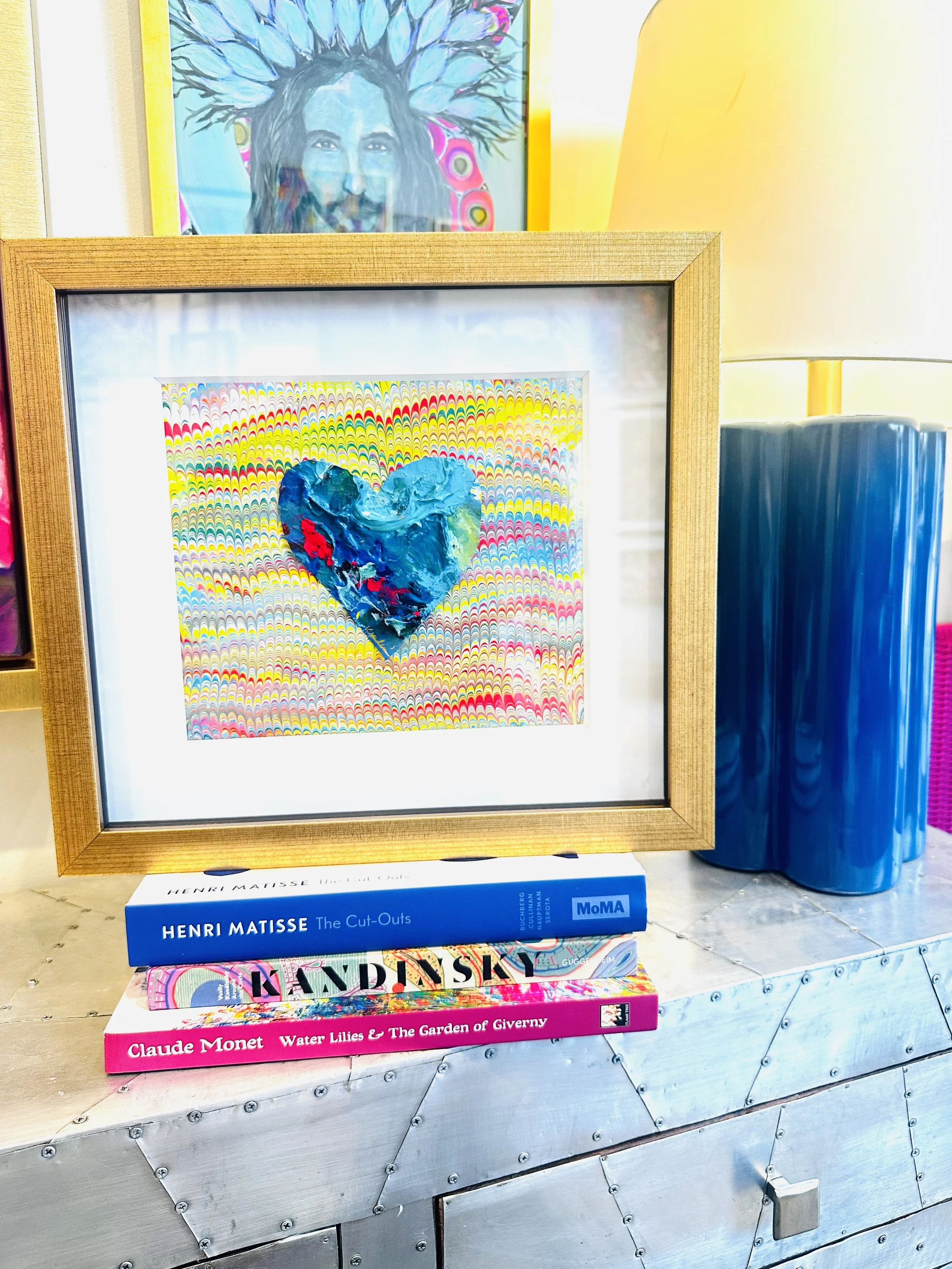 In this series you with find many shapes and sizes. Each is made with hand created marbled papers, globs of studio paint, and painted papers each of these crafted hearts is unique. Many are sculptural in nature extending from the surface with unusual textures. These are beautifully framed and have acrylic pour on top. They have a deep frame and can be on a shelf or hung.