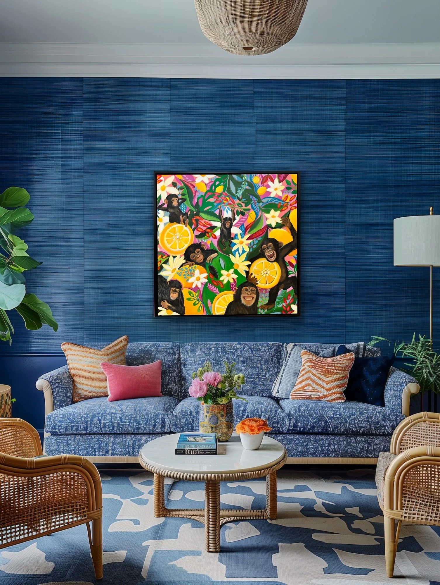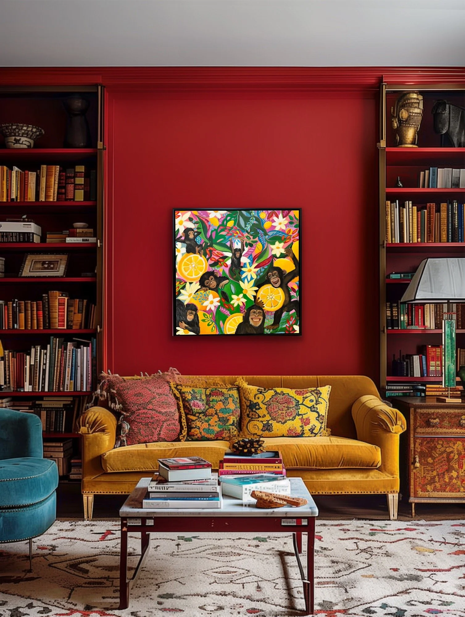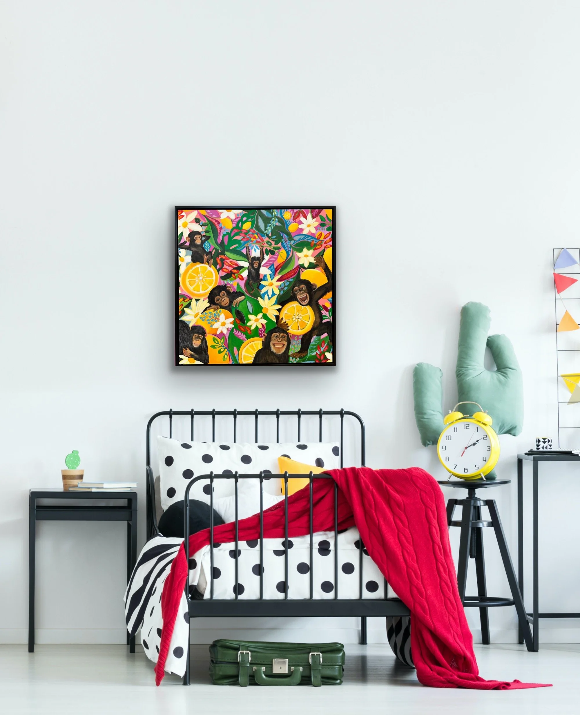 Main Squeeze is full of life as these vibrant chimps cavort in the lemon tree while patient momma gives cuddles to her little one. As my husband and I are expecting our first grandsons (twins!) I’m imagining all the adventures and monkeying around we will enjoy in this next season of grandparenting. The original is sold, but I’m offering a canvas reproduction. The piece is a 36”x36” giclee print on stretched high quality canvas. Let this piece bring some humor into your home!