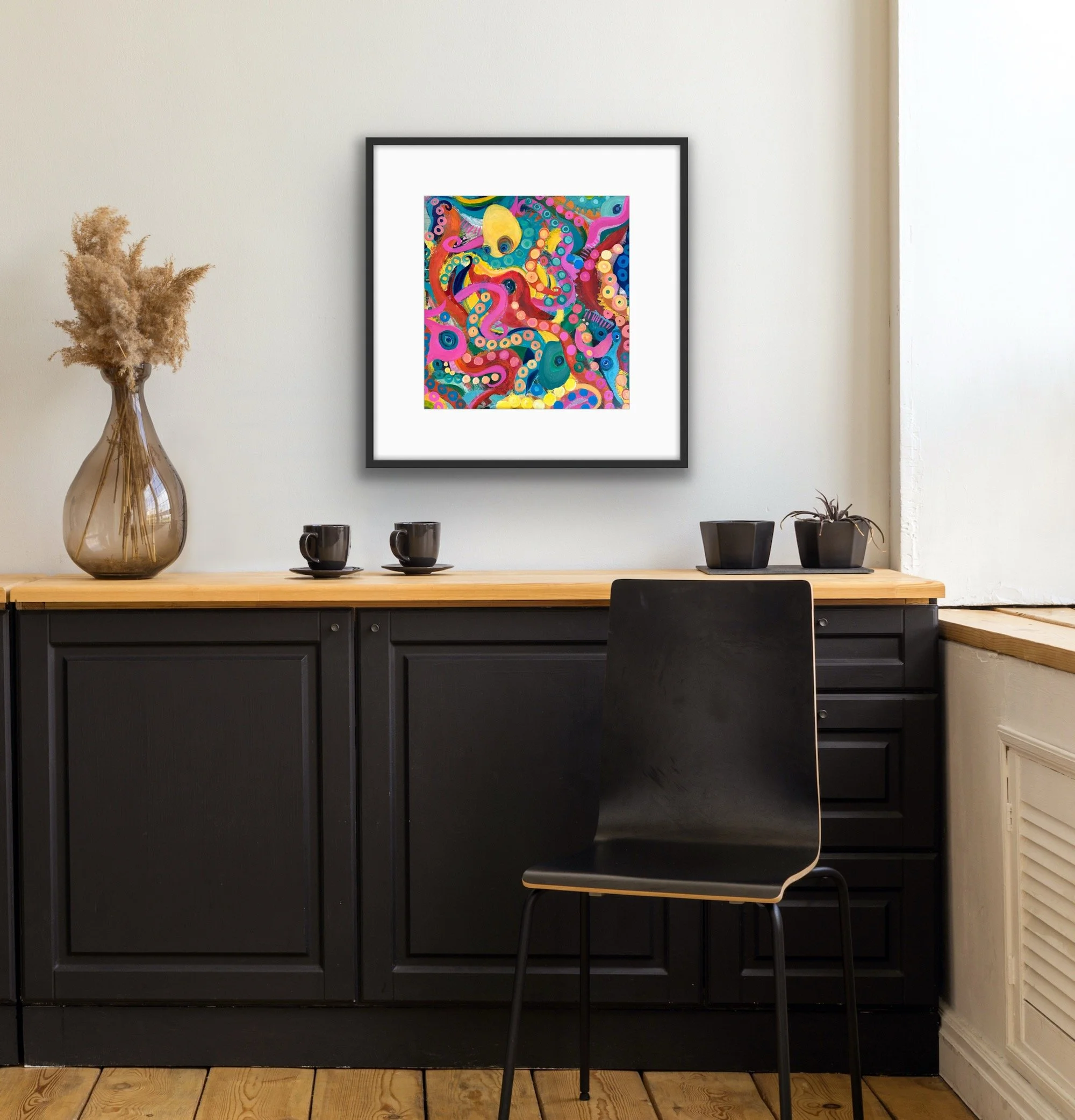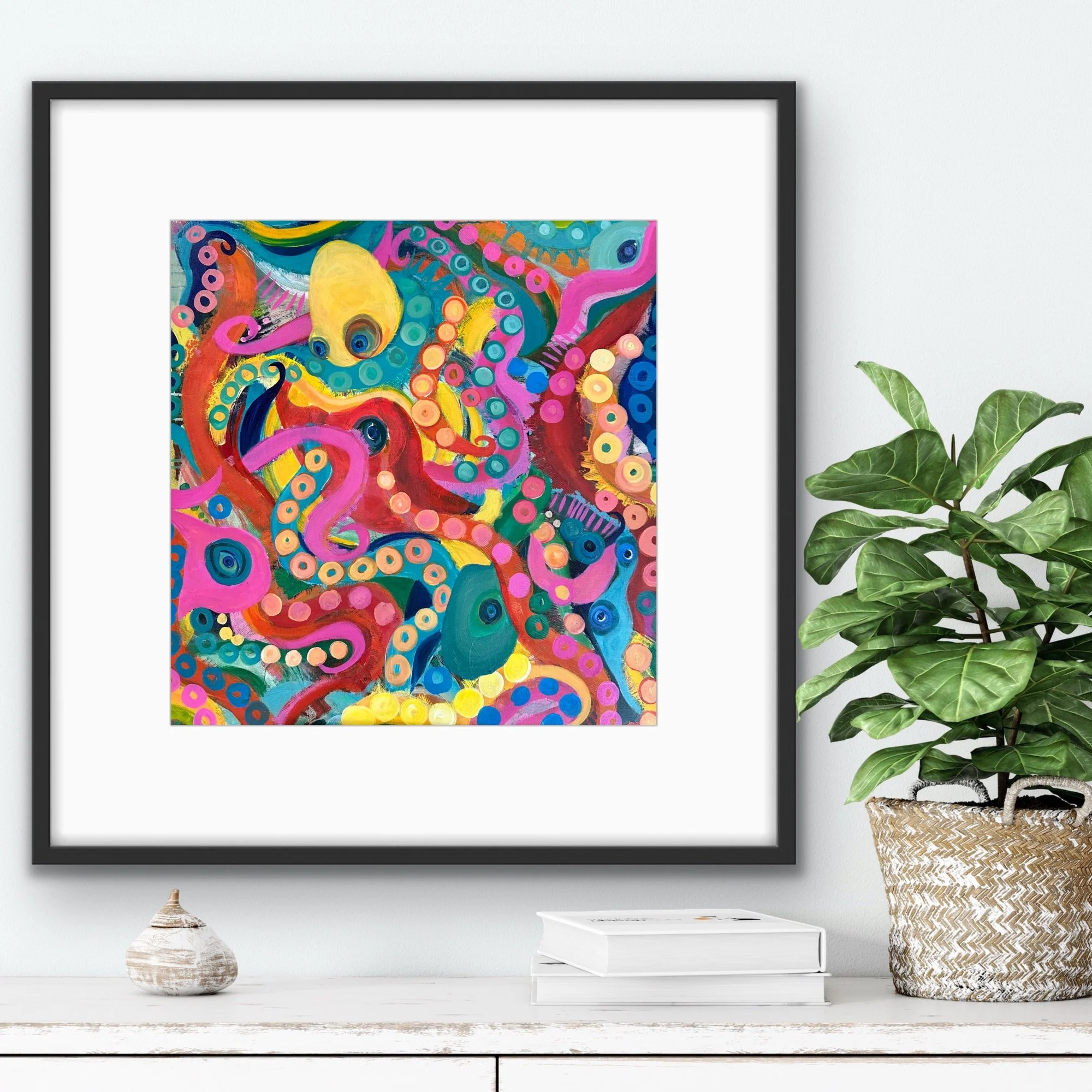 A wild tangle of colorful octopus wrap around this 17×17” print. The piece is on glossy art paper and has a 1/2” white border that makes it easy to frame with out losing the image. Each print is signed and numbered by the artist. Custom framing is available, please ask me about this!